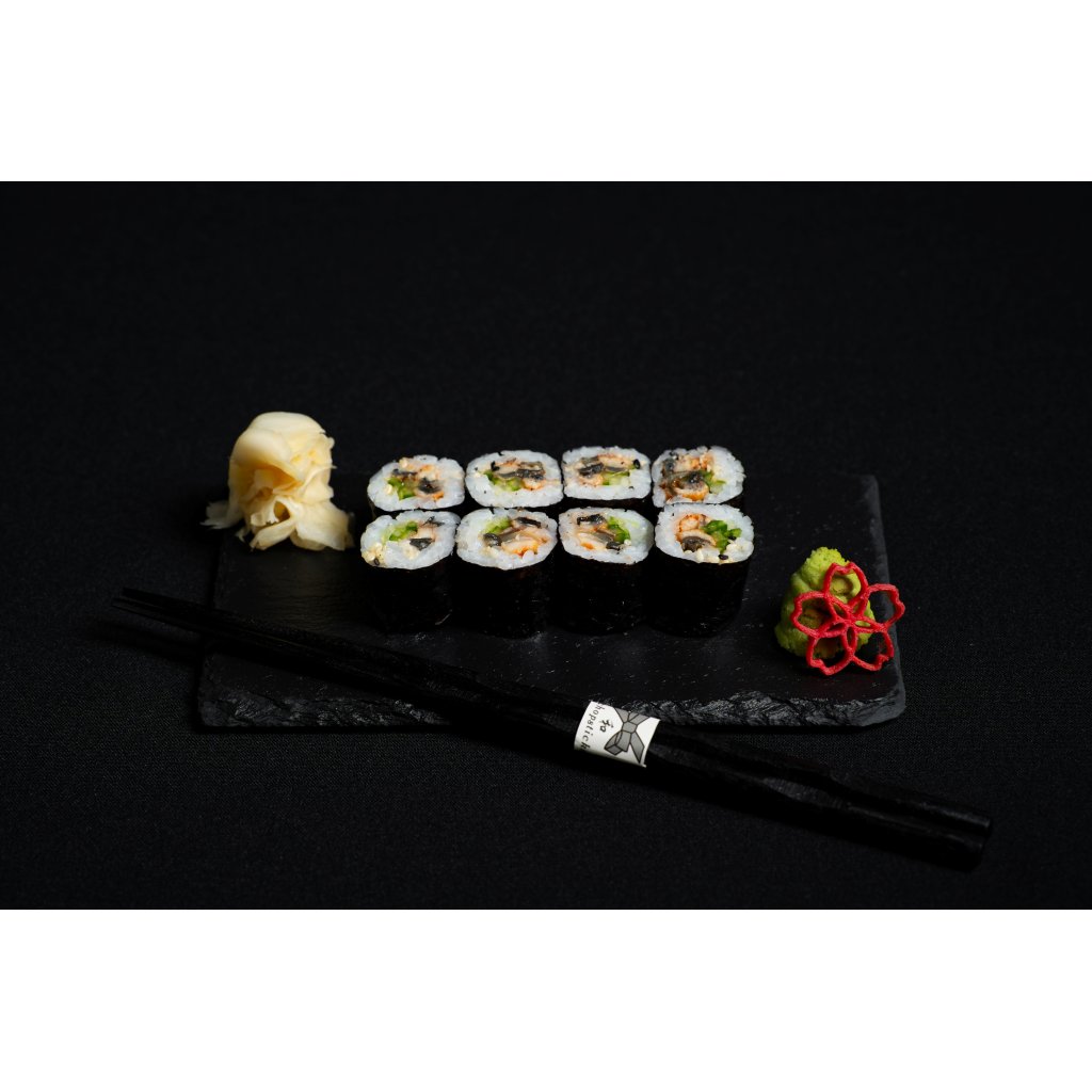 Lehká maki rolka plněná grilovaným úhořem a křupavou okurkou, doplněná sezamem a dochucená unagi omáčkou pro sladko-slaný tón.