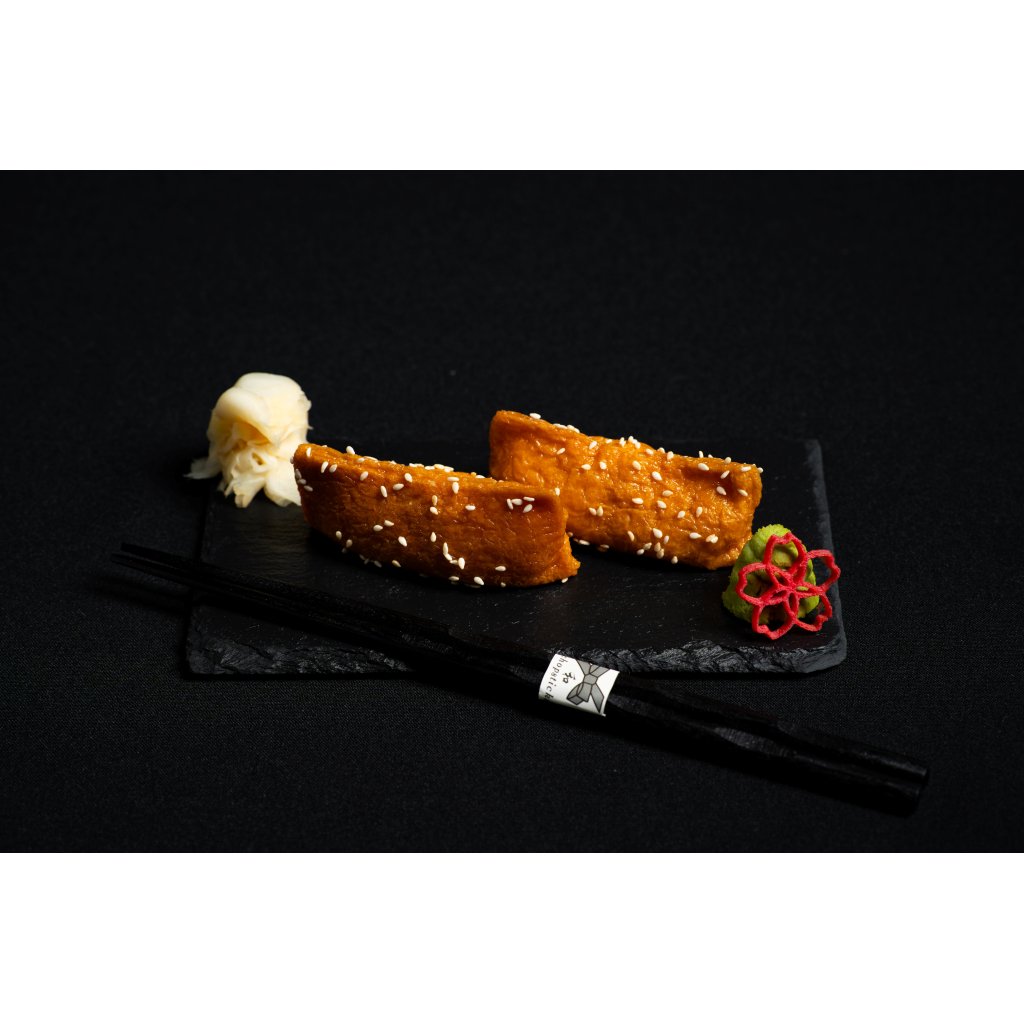 Dvojice inari kapsiček ze smaženého tofu, naložených ve sladké omáčce. Plněné jemnou sushi rýží a lehce posypané sezamem pro příjemný oříškový tón.