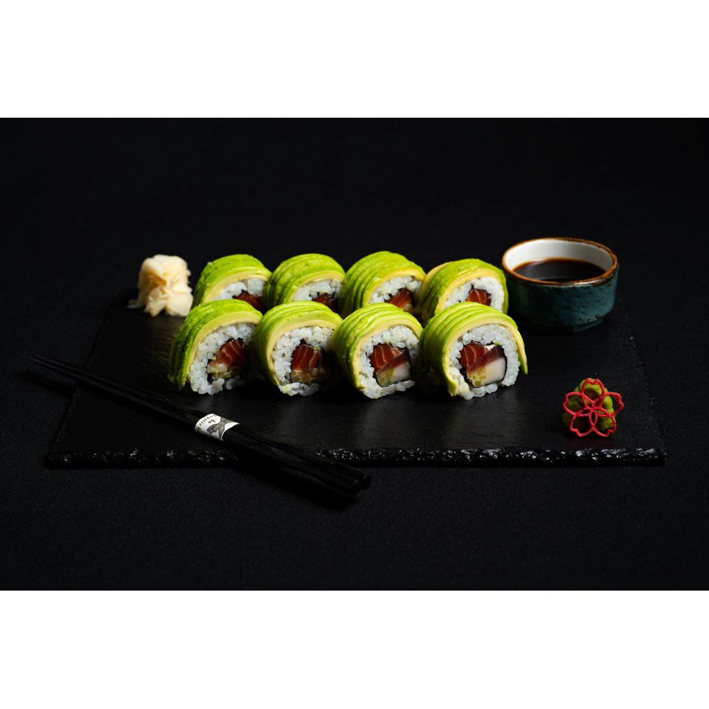 Barevná a vyvážená rolka plná prémiového lososa, tuňáka a máslové ryby, doplněná oshinkem a jemnou japonskou majonézou. Navrchu ji zdobí tenké plátky avokáda a lehce pikantní sezamová omáčka, která dodává výraznější a harmonický tón.