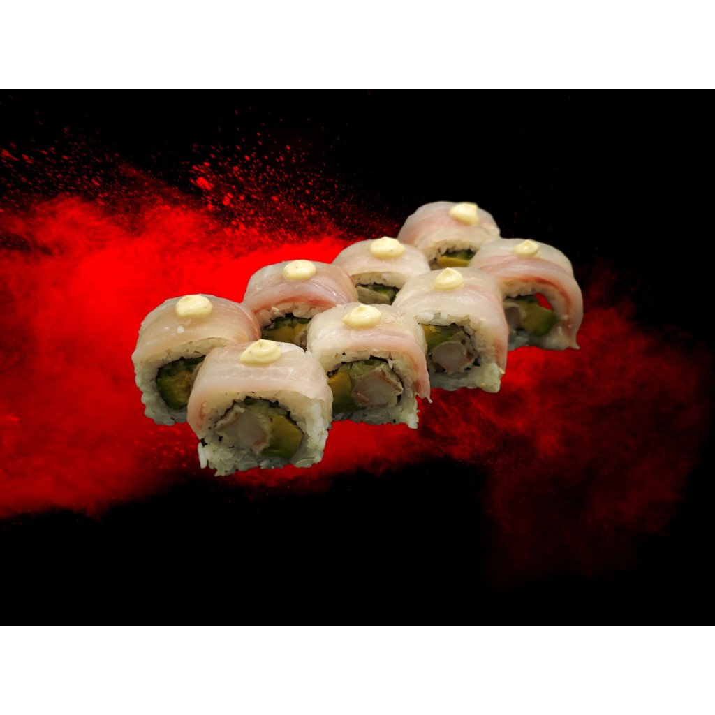 kreveta v tempuře, pražma královská, okurka, avokádo, sezam, uzená lanýžová majonéza