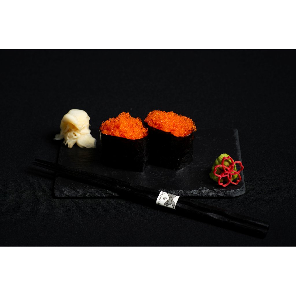 Dva gunkany naplněné tobikem — kaviárem z létajících ryb, který vyniká lehce slanou chutí a příjemnou křupavostí.
