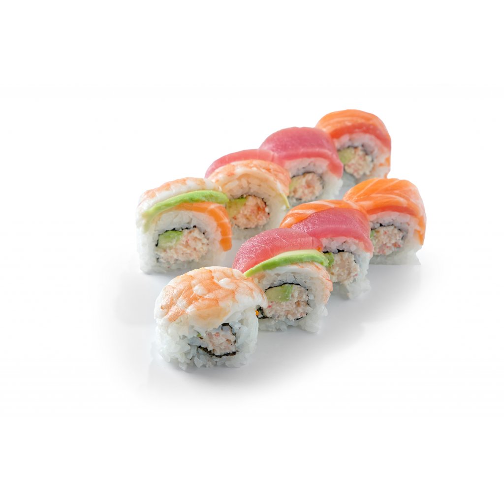 Barevná rolka plněná naším domácím krabím a krevetím surimi, krémovým avokádem, okurkou a japonskou majonézou. Navrchu střídají plátky lososa, tuňáka, krevety a avokáda, díky čemuž vytváří krásný „duhový“ vzhled.