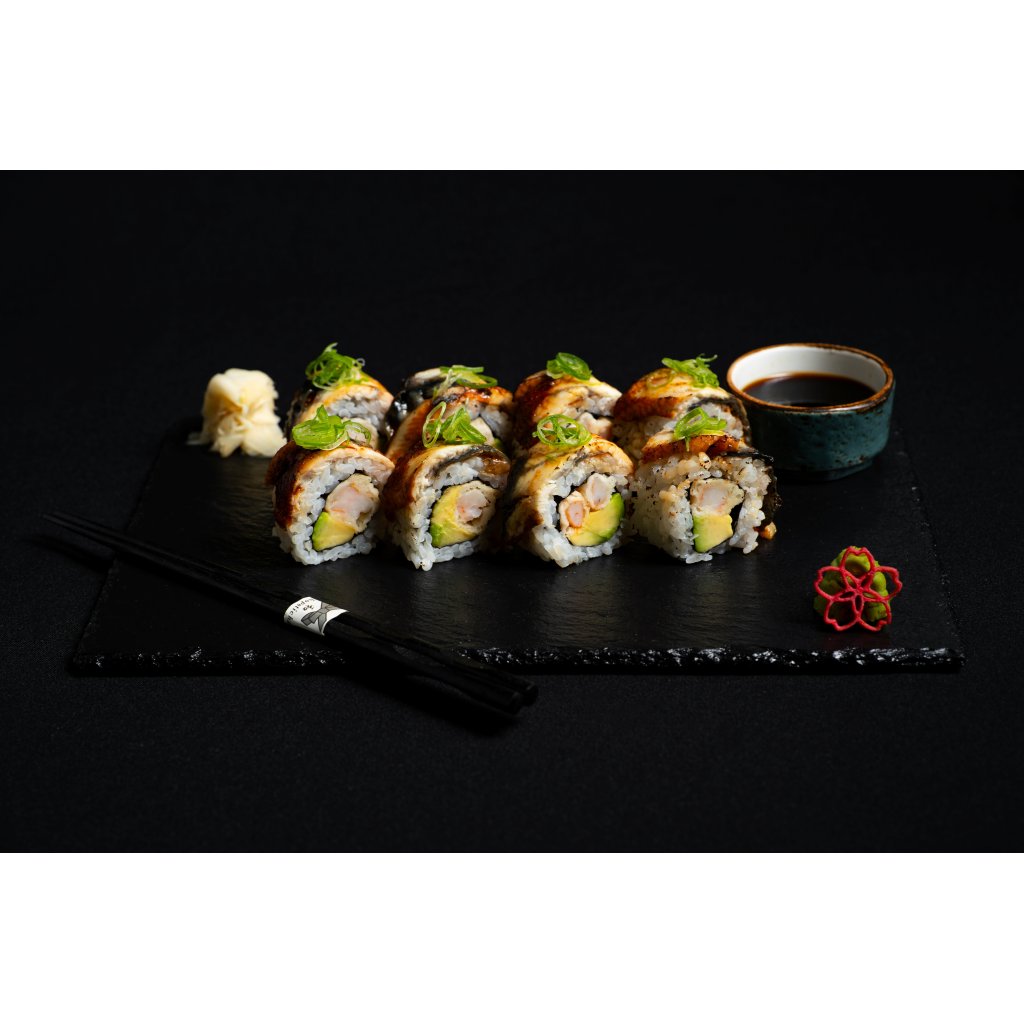 kreveta v tempuře, avokádo, úhoř, jarní cibulka a pikantní unagi omáčka