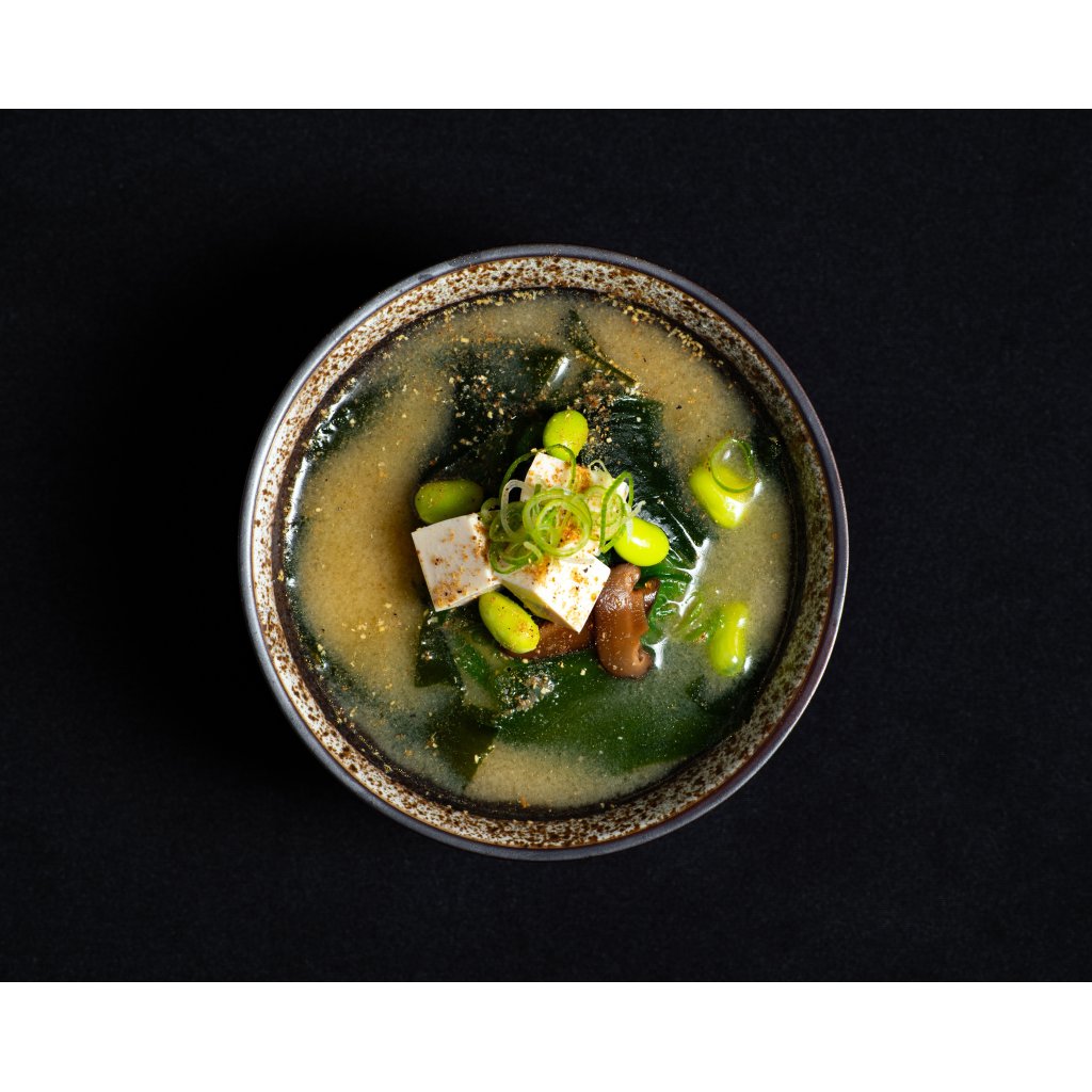 Naše miso polévka je postavená na shiro miso a autentickém vývaru dashi, který vyniká hlubokou umami chutí. Doplněná je edamame, wakame řasou, shiitake houbami, jemným tofu a špetkou sancho pepře, který dodává lehký citrusový nádech. Jarní cibulka celou chuť krásně rozsvítí. Tradiční japonská polévka v dokonale vyvážené prémiové podobě.