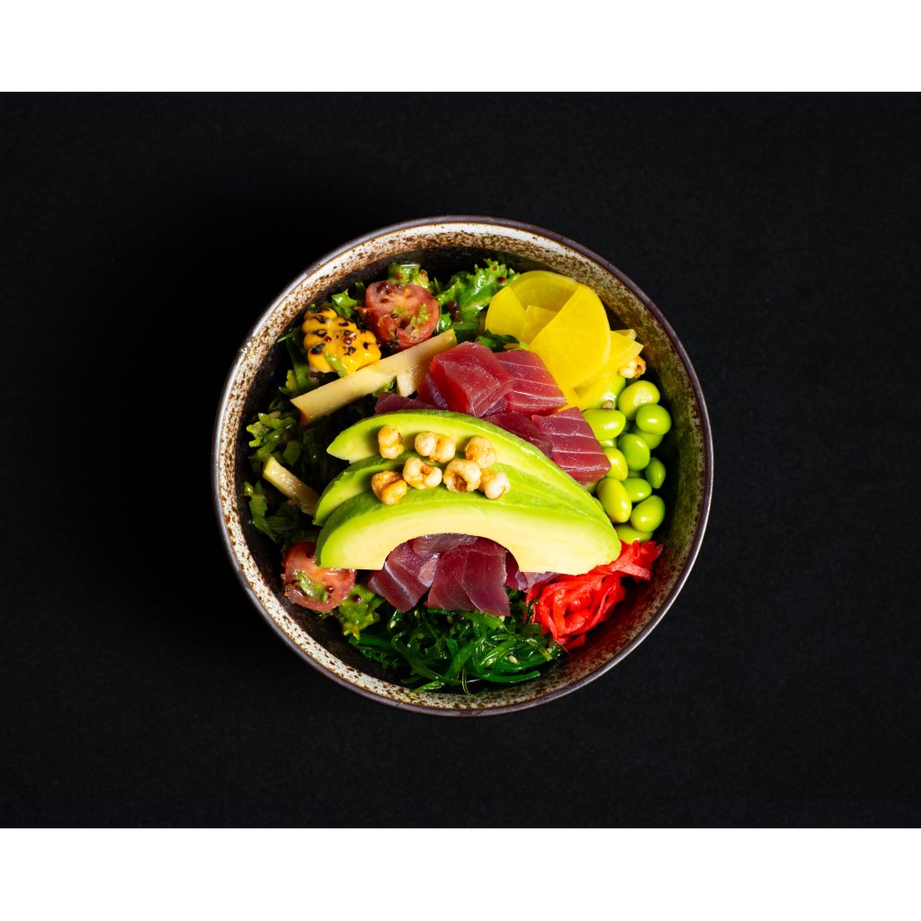 Základem naší poke bowl je jemná rýže ochucená sezamovým dresinkem a domácím furikake, které jí dodává autentické japonské aroma. K misce přidáváme edamame, goma wakame, benishoga zázvor, oshinko, salát z kadeřávku, krémové avokádo a křupavou kukuřici. Finální spojení chutí zajišťuje naše hedvábná unagi omáčka. Servírujeme s prémiovým čerstvým tuňákem.