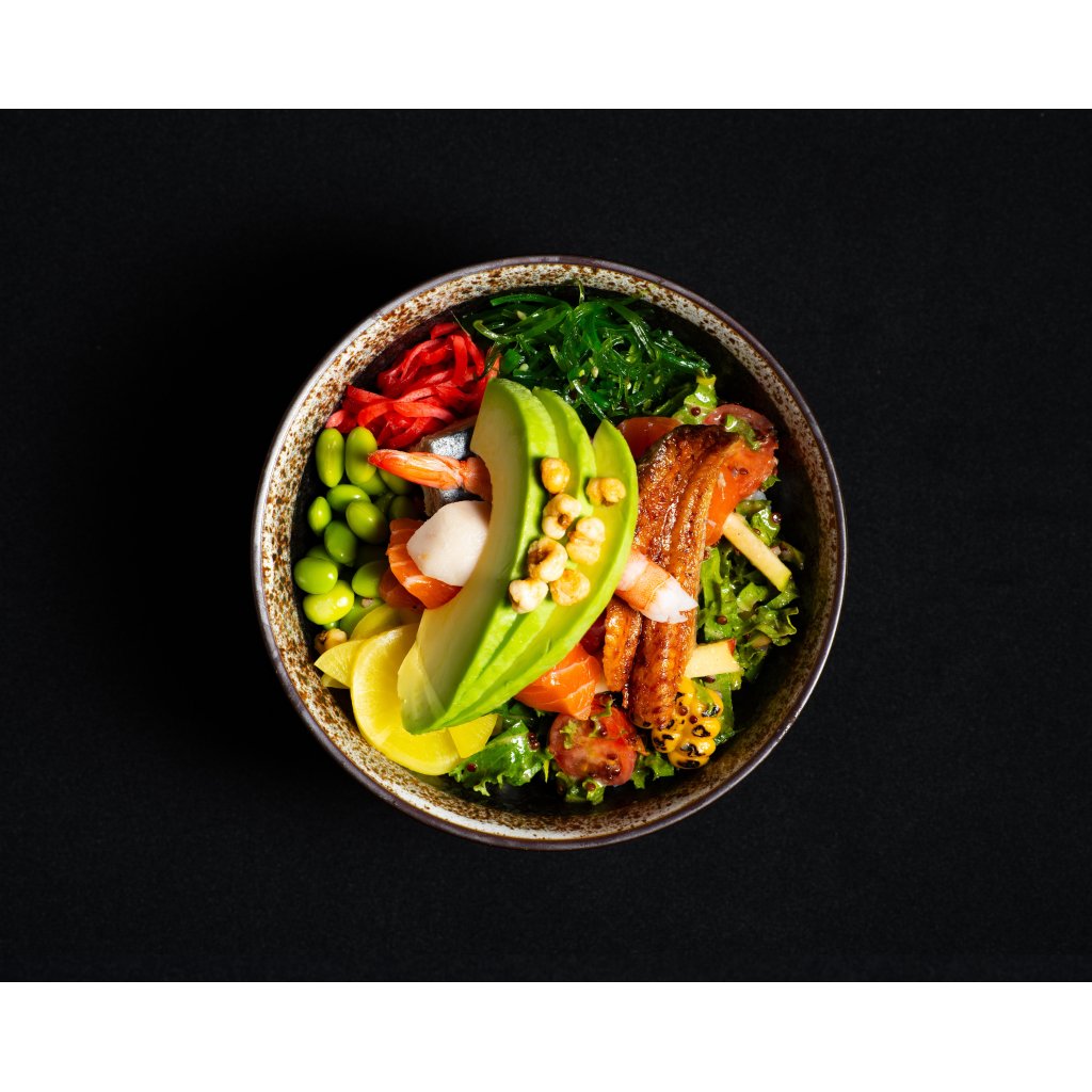 Základem naší poke bowl je jemná rýže ochucená sezamovým dresinkem a domácím furikake, které jí dodává autentické japonské aroma. K misce přidáváme edamame, goma wakame, benishoga zázvor, oshinko, salát z kadeřávku, krémové avokádo a křupavou kukuřici. Finální spojení chutí zajišťuje naše hedvábná unagi omáčka. Čerstvě míchané ryby podle denní nabídky.