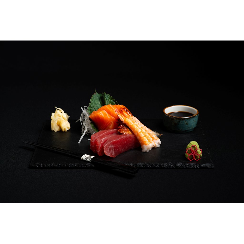Elegantní sashimi set složený z 3 plátků prémiového lososa, 3 plátků tuňáka, 6 krevet a 6 plátků úhoře. Servírováno na tenké ručně krájené bílé ředkvi s aromatickým shiso listem pro dokonalou prezentaci.