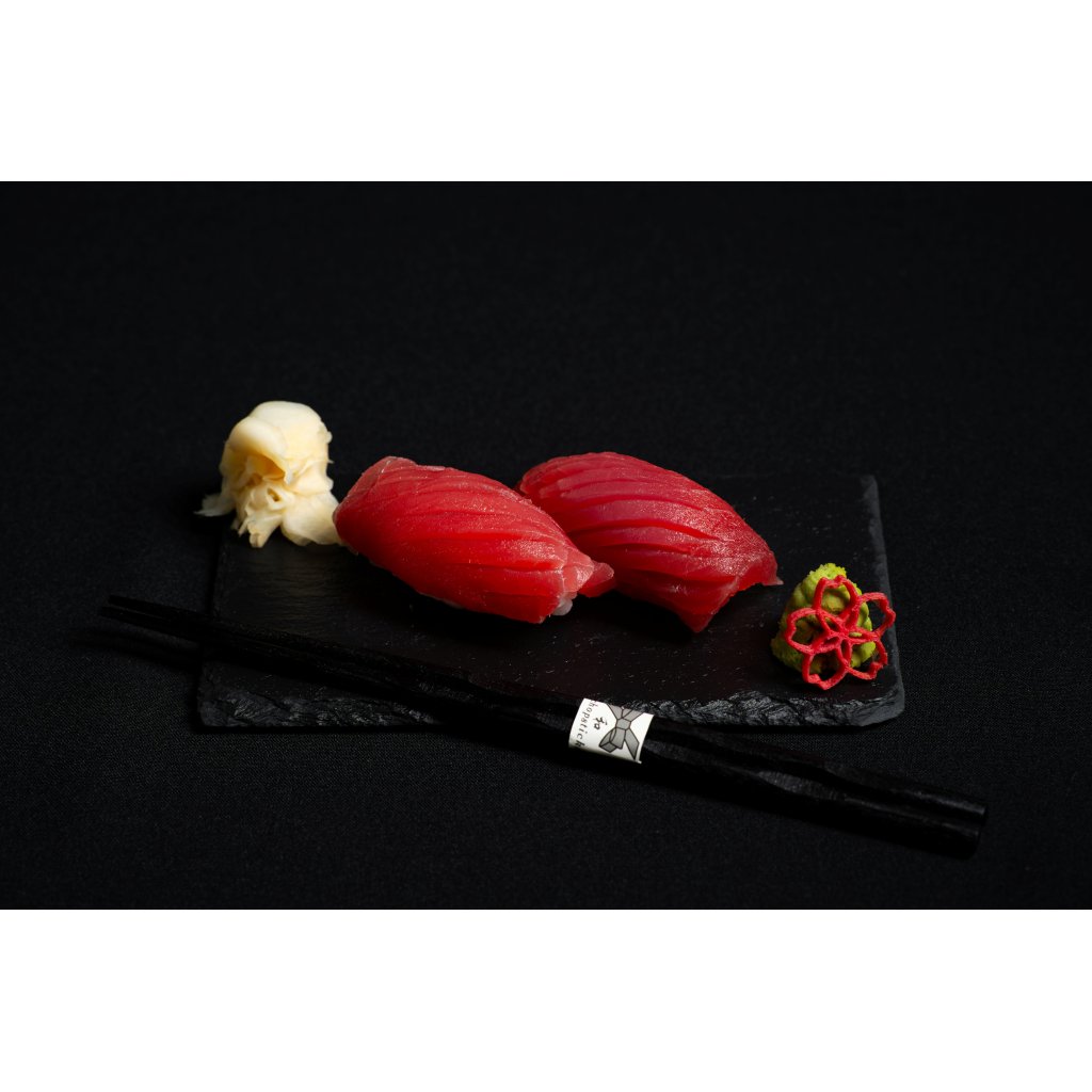 Dvojice nigiri z prémiového tuňáka z Malediv, který vyniká čistou oceánskou chutí a pevnou, elegantní strukturou. Perfektně ladí s nadýchanou sushi rýží.