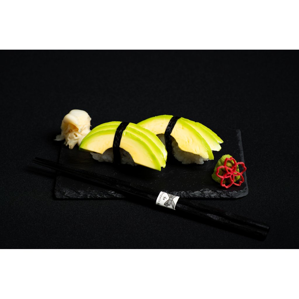Dvě nigiri zdobená čerstvými plátky avokáda, upevněnými tenkým proužkem řasy (nori) . Lehká, krémová a vyvážená vegetariánská volba.