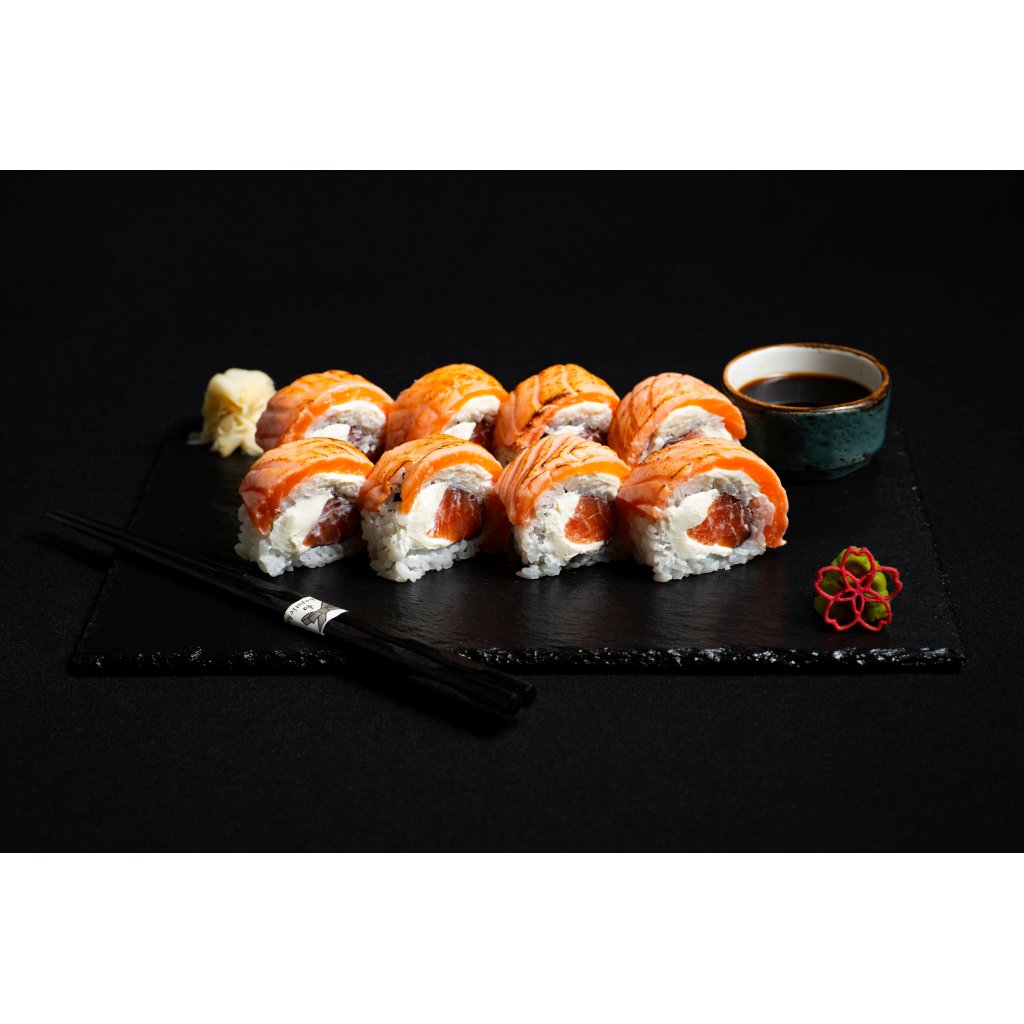 Philadelphia Aburi Losos je jeden z našich bestsellerů. Uvnitř najdete prémiový losos a krémový sýr Philadelphia. Navrchu rolku zdobí další vrstva Philadelphie, plátky lososa lehce opálené technikou aburi a jemná krémová unagi omáčka, která dodává karamelizovaný tón.