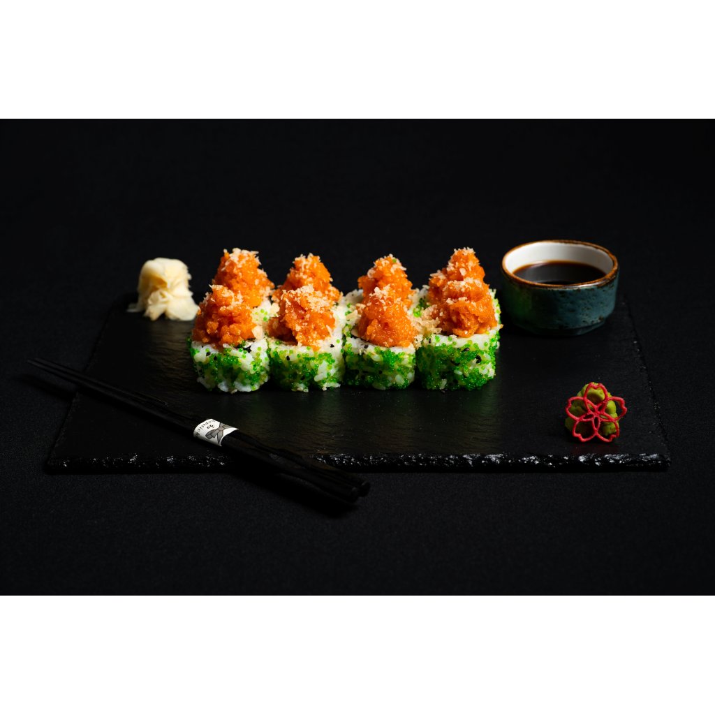 Rolka plná svěžích chutí uvnitř: avokádo, okurka, pažitka, wasabi tobiko a sezam. Navrchu ji zdobí štědré kopečky lososového tataráčku smíchaného s pikantní majonézou. Povrch je posypaný křupavým tanuki.