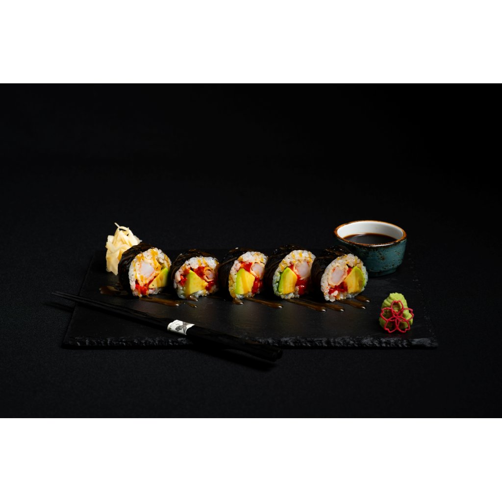 Svěží rolka, ve které se kreveta v tempuře spojuje s avokádem, pečenou paprikou a výrazným yuzu jamem. Navrchu doladěná krémovou unagi omáčkou.