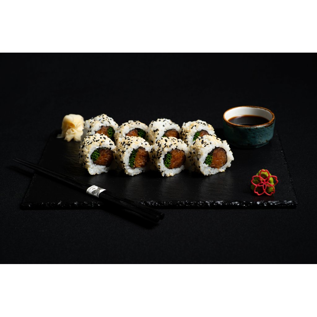 Rolka plná tuňákového tataráčku smíchaného s jemně pikantní majonézou, doplněného aromatickým shiso a čerstvou pažitkou. Navrchu posypaná sezamem.