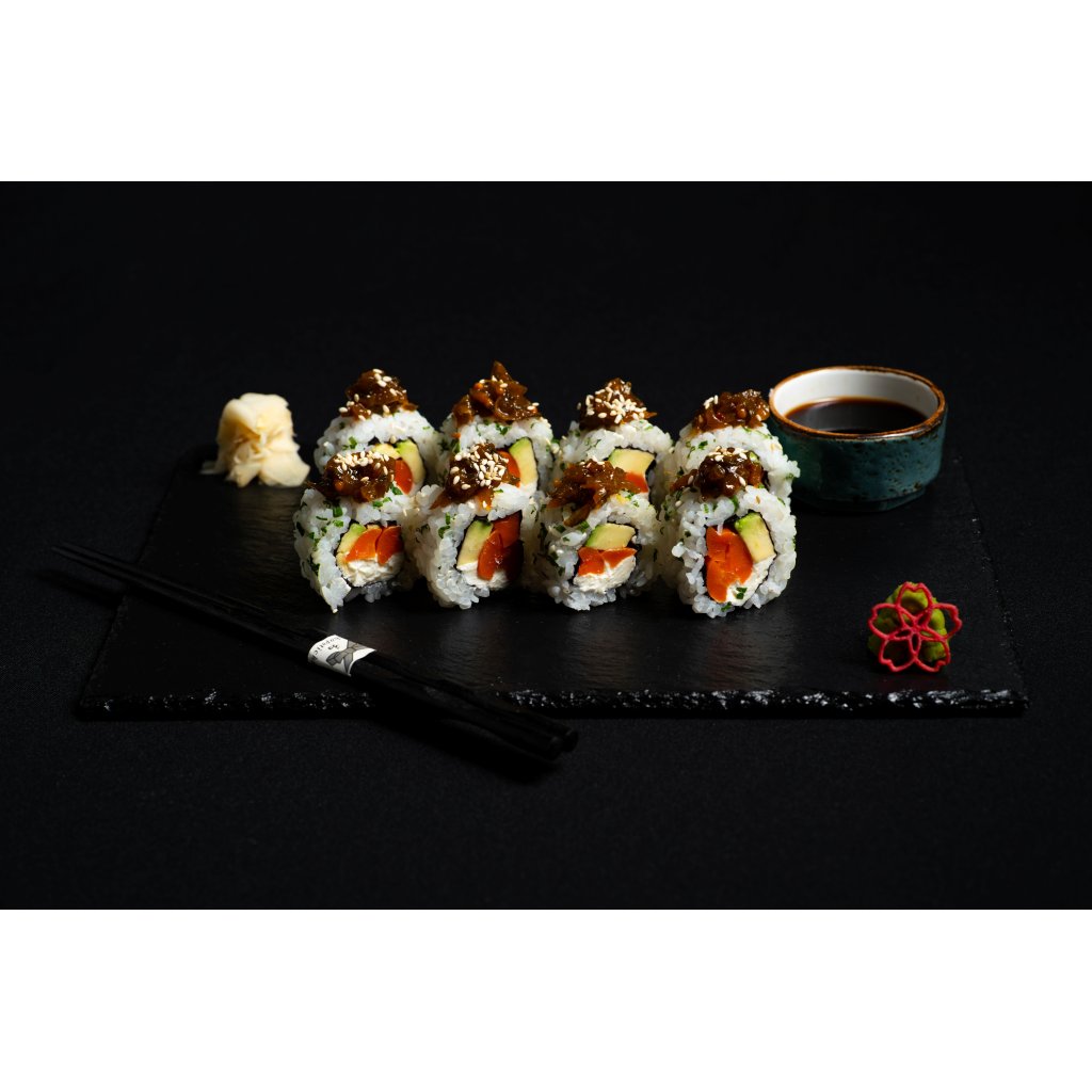 Zeleninová Philadelphia je svěží a skvěle vyvážená rolka plná chutí: uvnitř karamelizovaná mrkev, avokádo, sýr Philadelphia, pažitka a sezam. Navrchu ji doplňuje domácí okurkové chutney, které dodává lehkou a svěží linku.