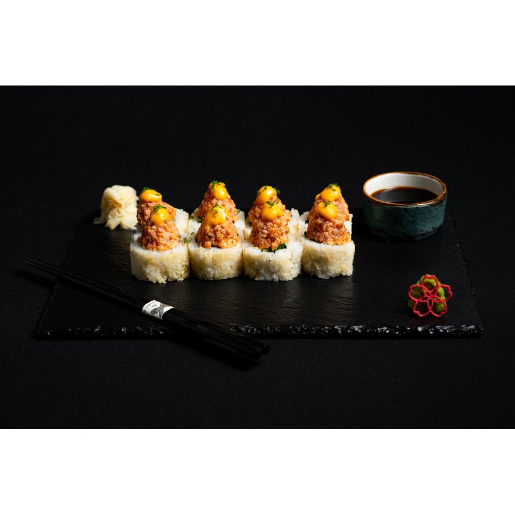 Výrazná a velmi oblíbená rolka. Uvnitř najdeš avokádo, okurku, japonskou majonézu, pažitku a křupavé tanuki. Navrchu jsou kopečky lososového tataráčku smíchaného s naším domácím furikake kořením a pikantní majonézou. Losos je lehce opálený, což dodává neodolatelnou vůni.