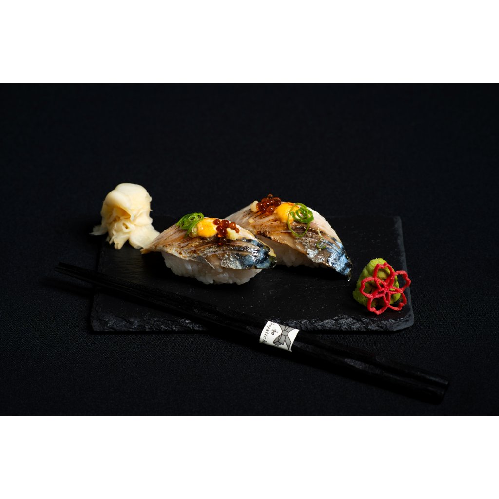 Dvojice nigiri s makrelou ve stylu shime (naložena v octe) a lehce opálenou pro výraznější chuť. Zdobené zázvorem, jarní cibulkou, pikantní majonézou a domácím ponzu kaviárem, který dodává citrusově-umami tón.
