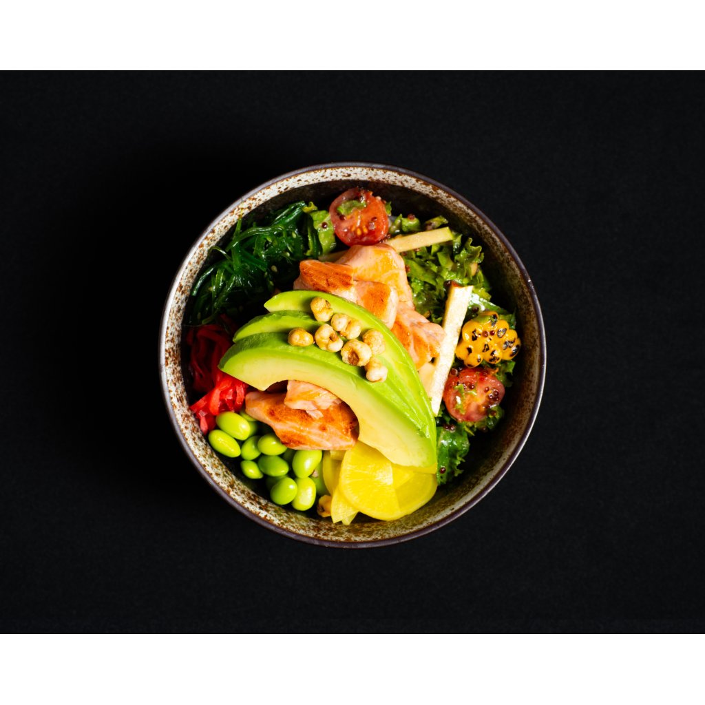 Základem naší poke bowl je jemná rýže ochucená sezamovým dresinkem a domácím furikake, které jí dodává autentické japonské aroma. K misce přidáváme edamame, goma wakame, benishoga zázvor, oshinko, salát z kadeřávku, krémové avokádo a křupavou kukuřici. Finální spojení chutí zajišťuje naše hedvábná unagi omáčka. Servírujeme s grilovaným lososem.
