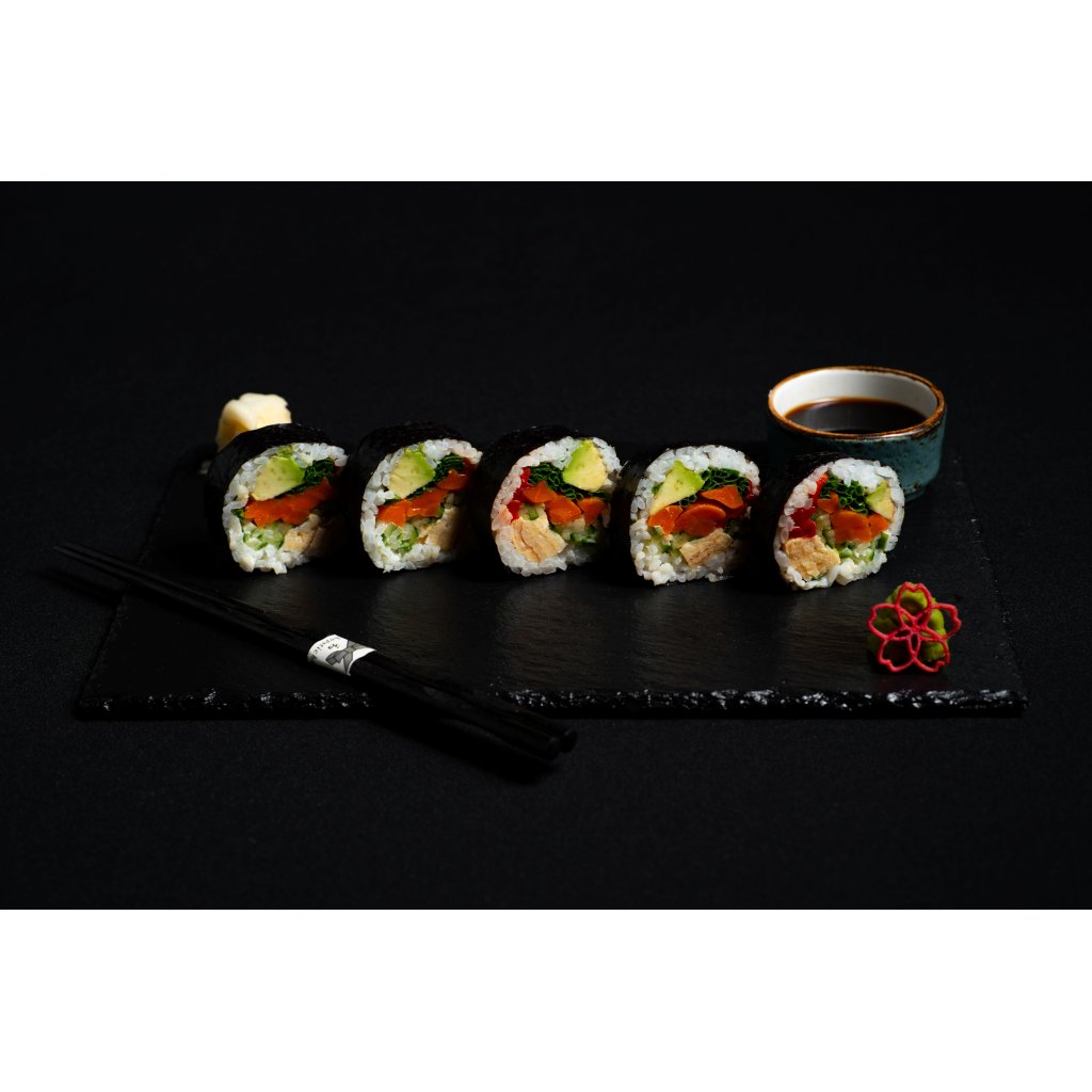 Bohatá vegetariánská futomaki rolka plná barev a chutí. Kombinuje krémové avokádo, svěží okurku, sladkou karamelizovanou mrkev, jemnou japonskou omeletku a pečenou papriku, vše propojené lehkou japonskou majonézou a aromatickou pažitkou. Sytá, pestrá a překvapivě výrazná volba bez masa.