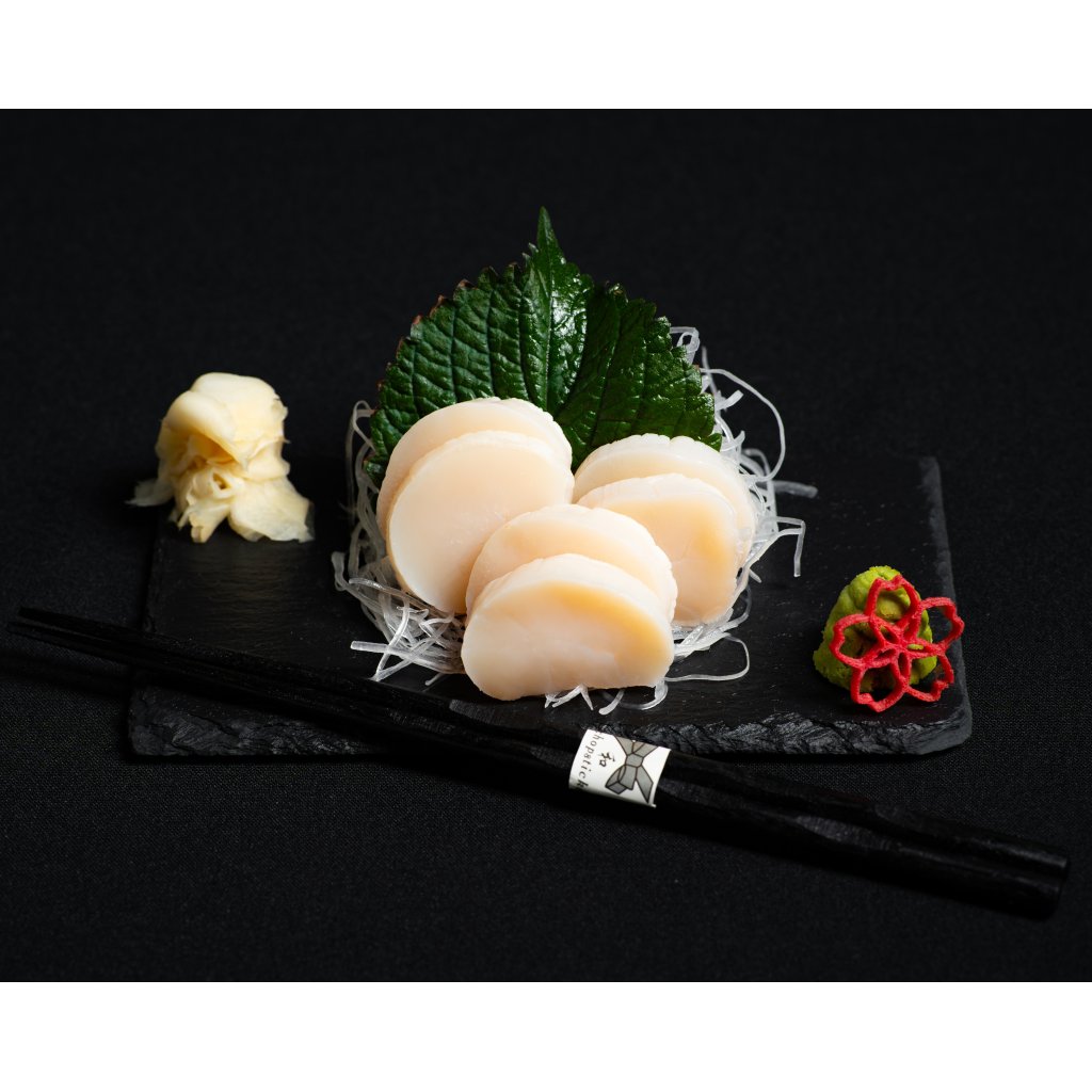 Prémiové sashimi z mušlí sv. Jakuba pocházejících z japonského ostrova Hokkaidó. Podáváme je s jemně krájeným daikonem (bílou ředkví) a lístkem shiso, které zvýrazní jejich čistou, lehce sladkou chuť.