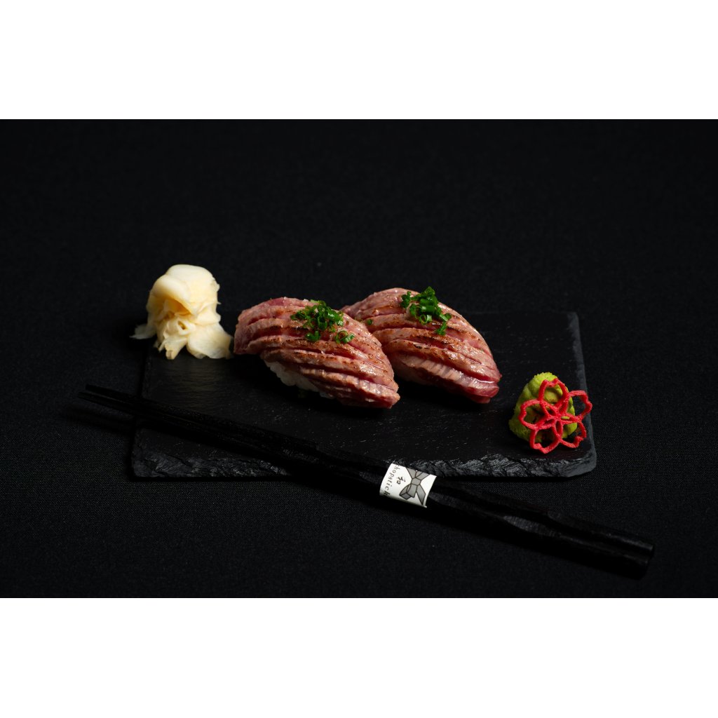 Wagyu Aburi Nigiri představuje vrchol našeho menu. Používáme japonské hovězí Wagyu A5 striploin — maso nejvyšší světové kvality, známé svou extrémní jemností a bohatým mramorováním. Každý kousek je lehce opálený technikou aburi, aby se tuk krásně rozvoněl a vytvořil sametovou, máslovou texturu. Finální dotek tvoří uzená mořská sůl a čerstvá pažitka, které zvýrazňují hlubokou chuť masa. Luxusní, nezapomenutelné sousto.