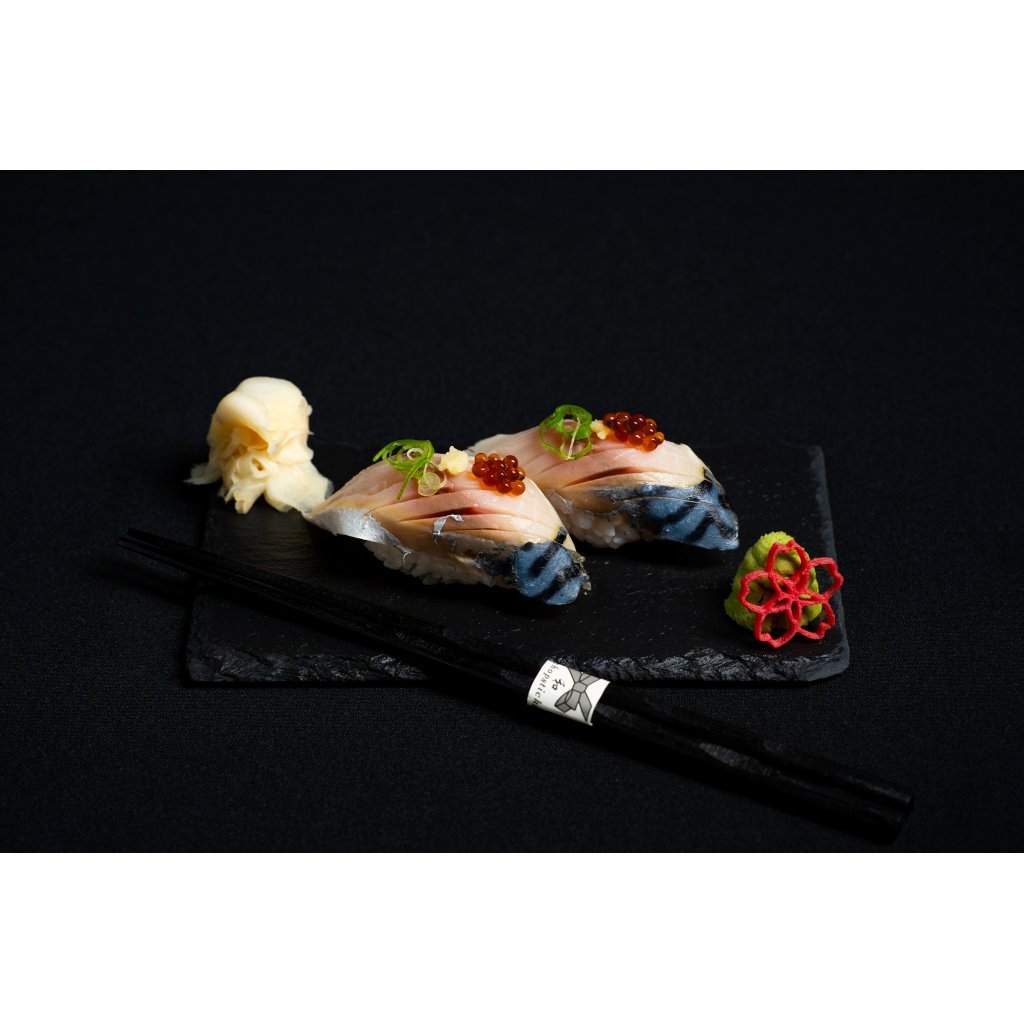 Dvojice nigiri s makrelou připravenou tradiční metodou shime – jemně naloženou v octě pro zvýraznění chuti. Zdobené zázvorem, jarní cibulkou a domácím ponzu kaviárem, který dodává citrusově-umami tón.