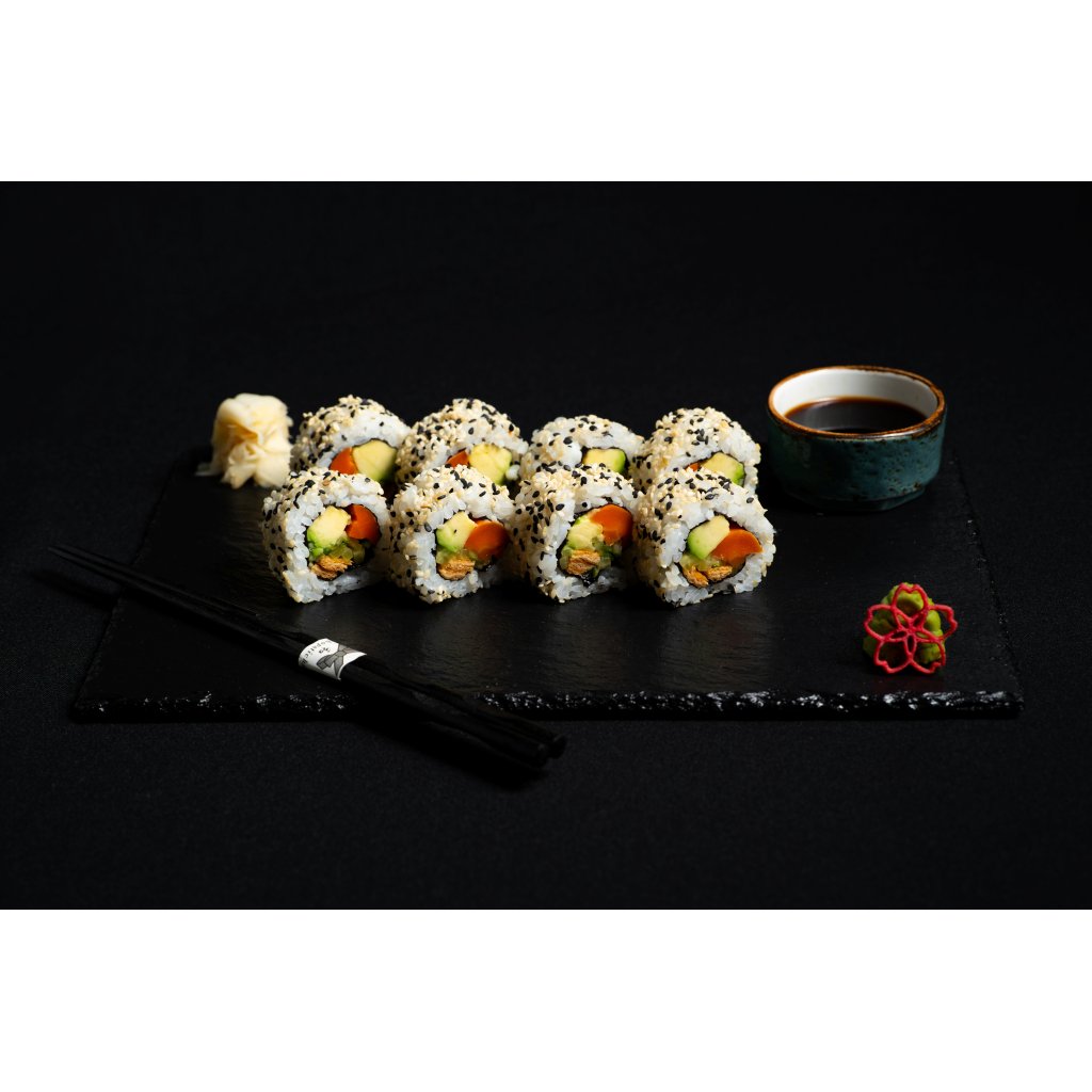 Vegetariánská rolka plná chutí: karamelizovaná mrkev, inari, oshinko, krémové avokádo, okurka a jemná japonská majonéza. Navrchu posypaná sezamem.