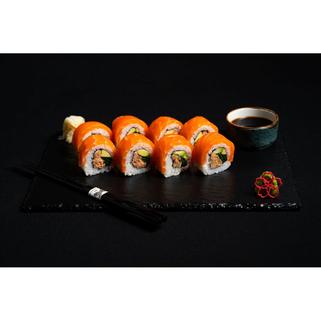 Sake Nibai přináší dvojnásobný zážitek z lososa. Uvnitř najdete šťavnatý grilovaný losos v teriyaki omáčce, doplněný pažitkou a krémovým avokádem. Povrch rolky je potažený tenkými, dokonale čerstvými plátky lososa, které dodávají luxusní chuť i vzhled. Ideální volba pro milovníky lososa, kteří chtějí opravdu něco navíc.